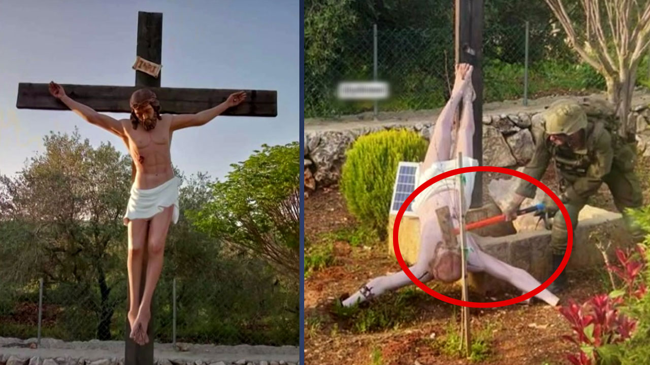 사진을 보면 이스라엘 병사가 큰 망치로 십자가에서 분리돼 땅에 떨어져 있는 예수상의 머리를 내리치는 모습이 담겼습니다.