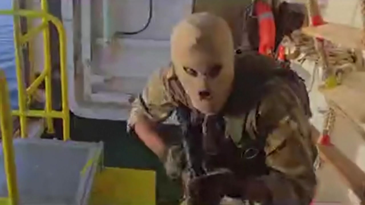 영상에는 무장한 대원들이 복면을 쓰고 사다리로 화물선에 승선하는 모습이 담겼습니다.