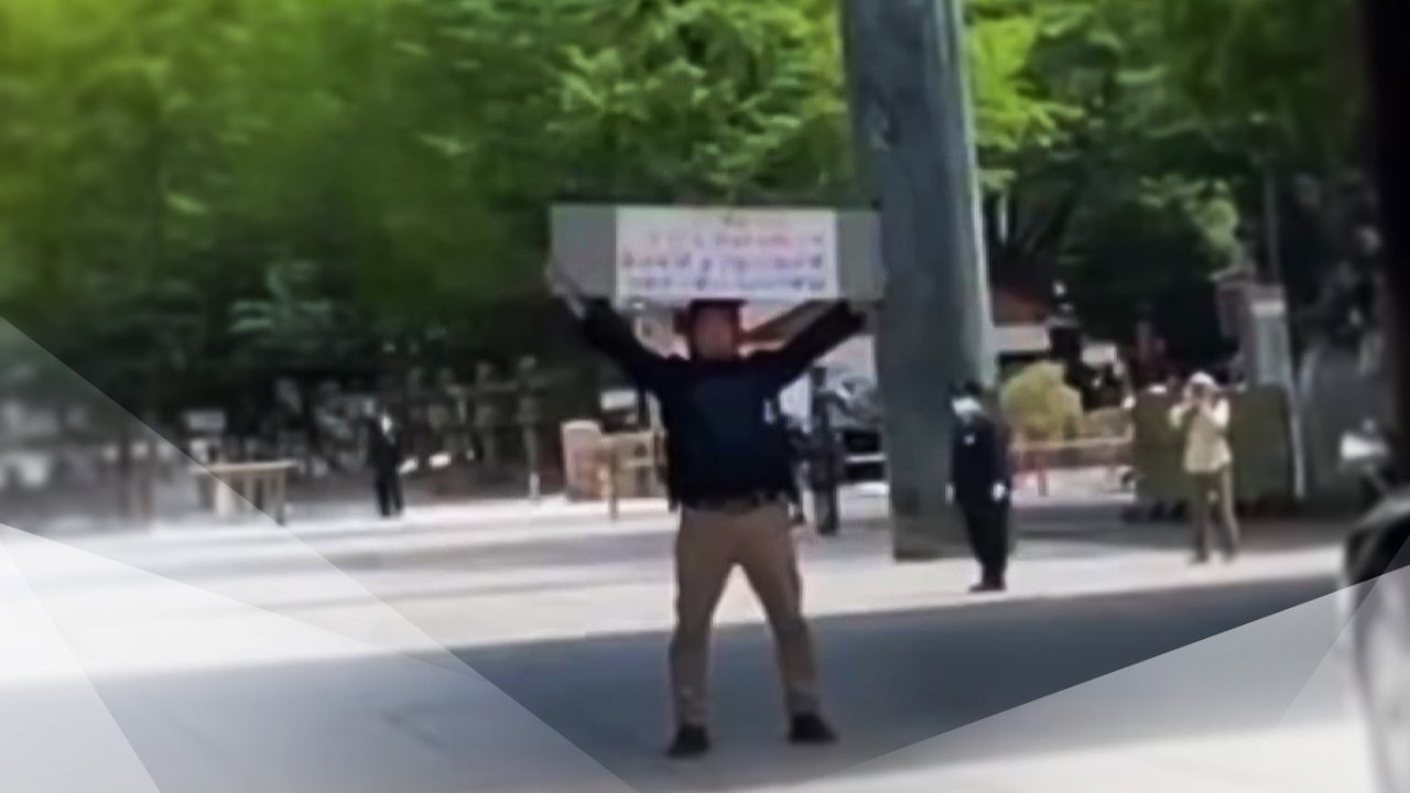 현수막을 펼치자 관계자들이 뛰어와 황급히 끌어냅니다.