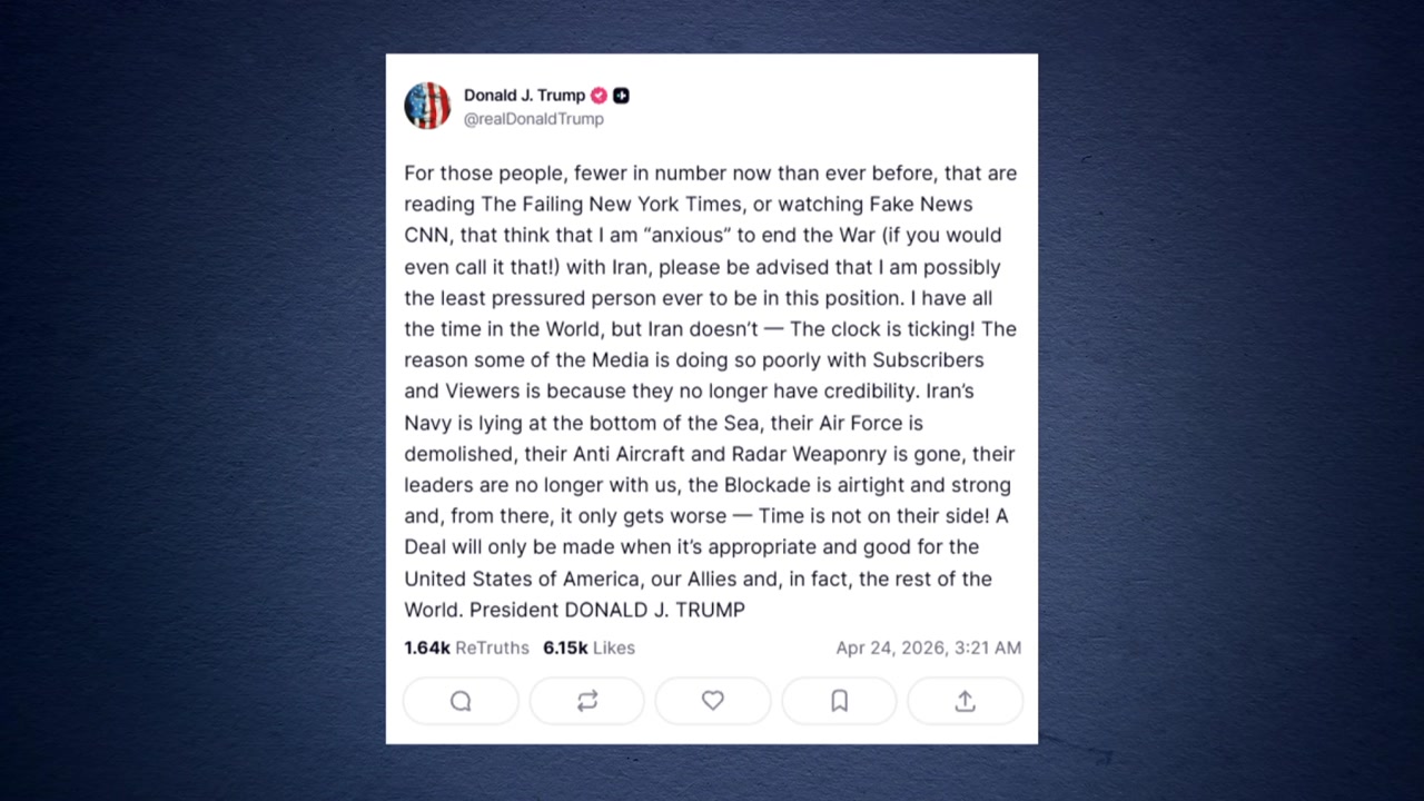 트럼프 대통령은 시간은 이란의 편이 아니라며 이란과의 합의는 미국 등 전 세계에 적합하고 유익할 때에만 이뤄질 것이라고 주장했습니다.