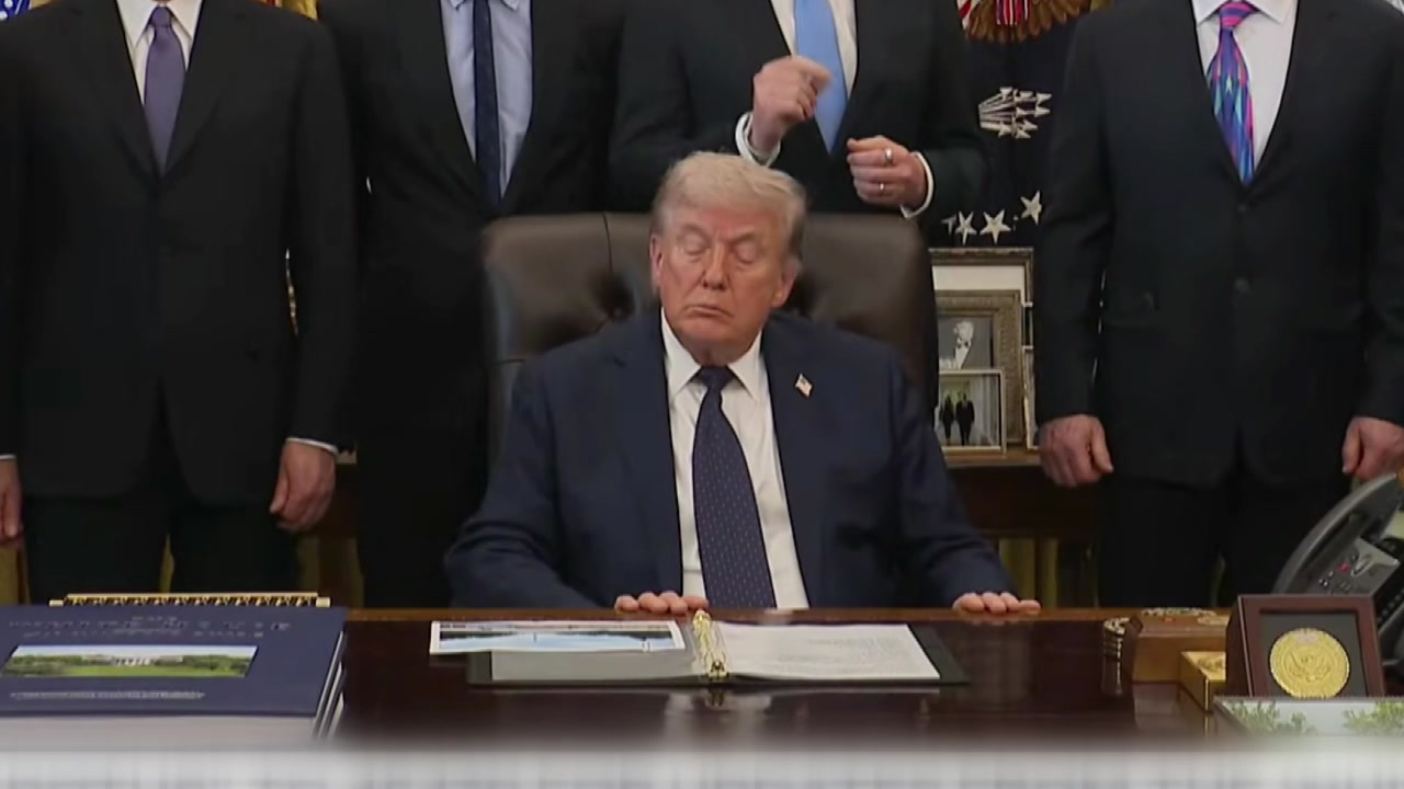 앉아 있는 트럼프 대통령 뒤로 하워드 러트닉 상무 장관부터, 여러 참모진들이 모여 있죠.