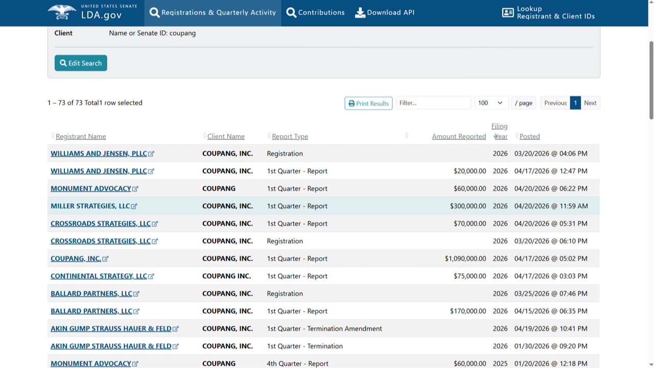 미국 연방 상원의 로비 공개법 보고서에서 쿠팡의 미국 워싱턴 시애틀에 기반을 둔 모회사 쿠팡Inc는 올해 1분기 로비 자금으로 109만 달러, 우리 돈 16억 원을 지출했다고 신고했습니다.