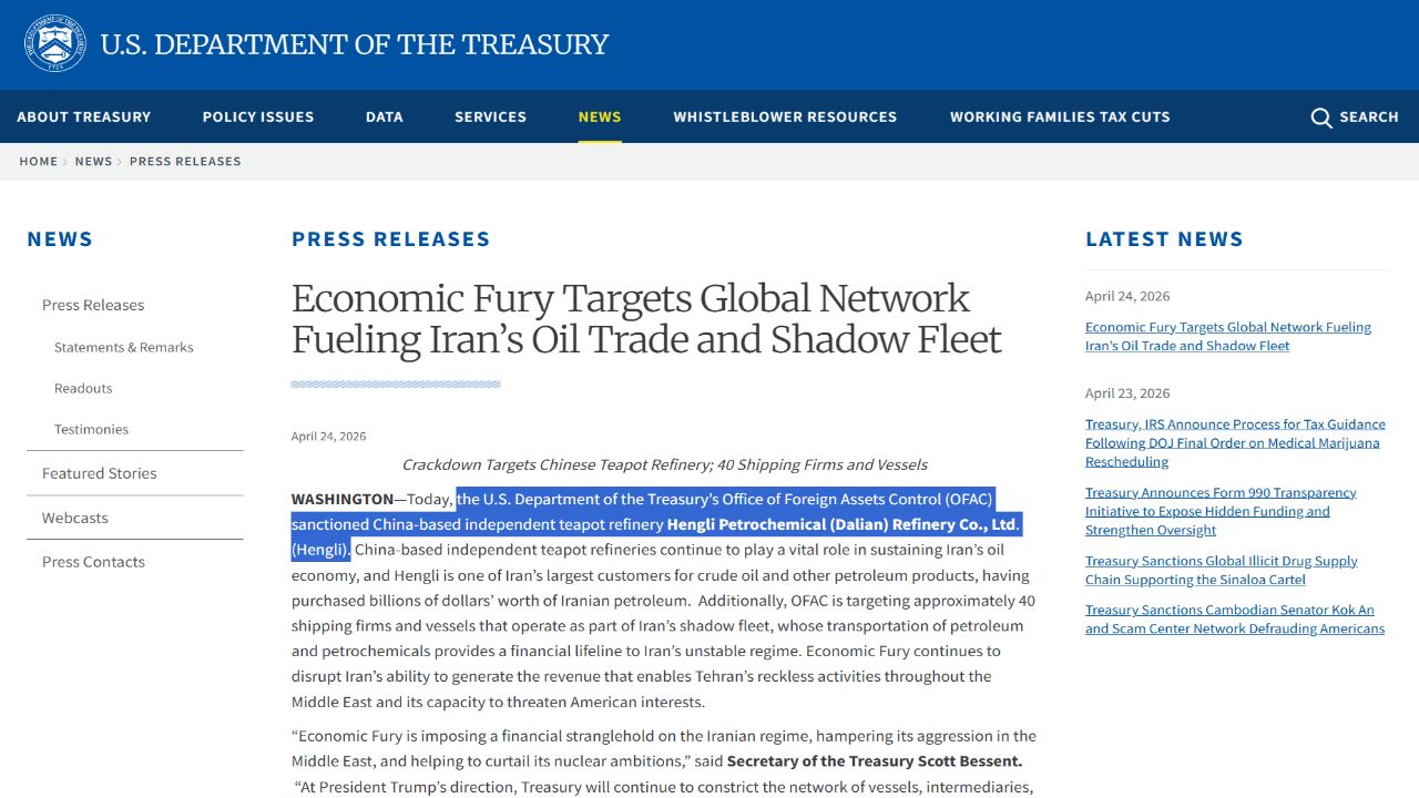 미 재무부의 제재 발표는 이란에 대한 해상 봉쇄에 이어 이란의 최대 석유 수출국인 중국을 지렛대 삼아 이란이 종전 협상에서 미국의 요구를 최대한 수용하도록 양측을 압박하려는 조치로 풀이됩니다.