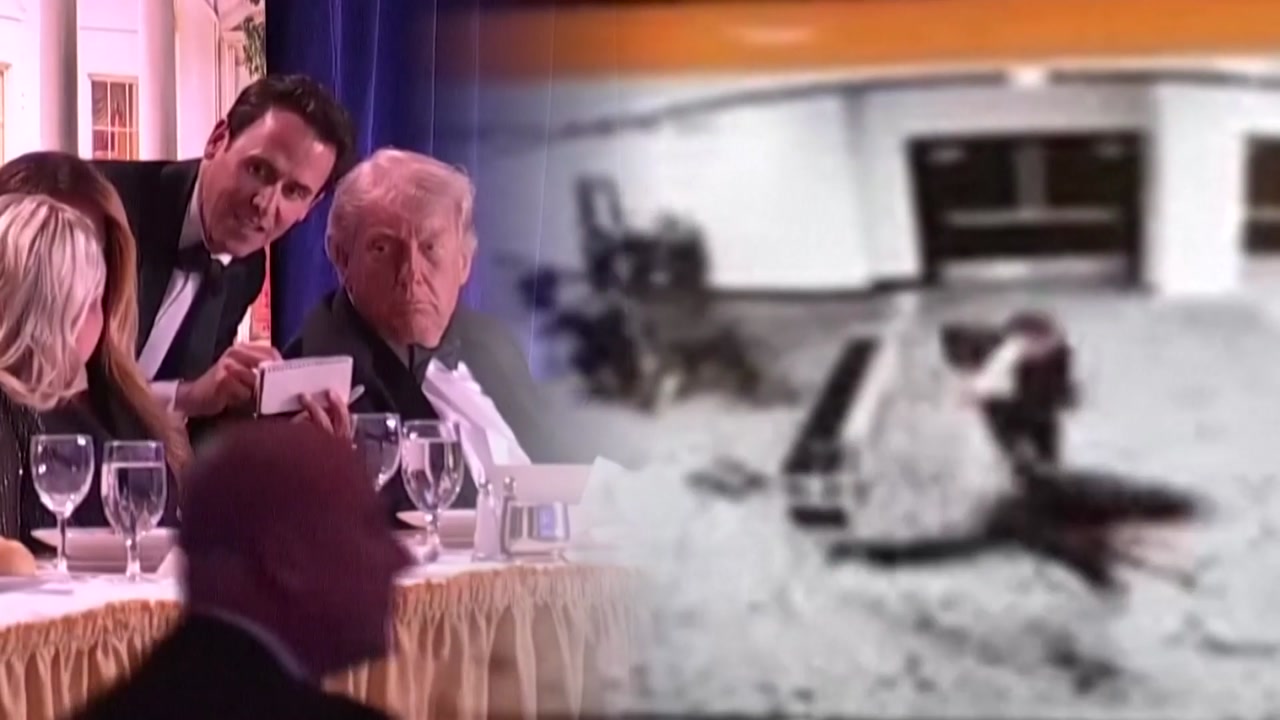 커다란 총격음이 울려 퍼지자 도널드 트럼프 미국 대통령이 참석한 만찬장은 순식간에 아수라장으로 변하고, 곧이어 경호요원들이 트럼프 대통령을 에워싸 행사장 밖으로 빠져나갑니다.