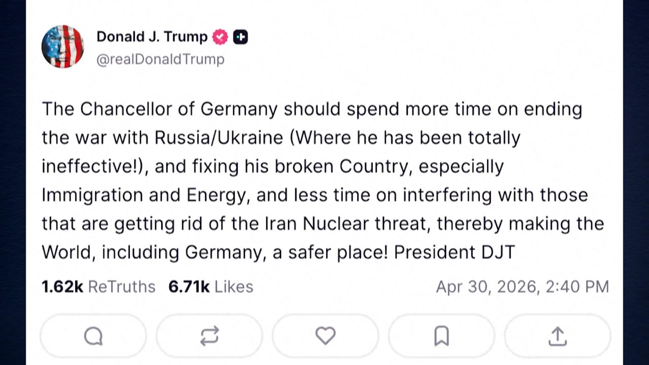 메르츠 총리가 지난 27일 "이란은 예상보다 훨씬 강하고, 미국은 협상에서도 설득력 있는 전략이 없다"며 미국 전체가 이란에 굴욕을 당하고 있다고 발언한 데 대해 연일 저격에 나선 겁니다.