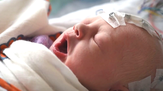 갓 태어난 아기가 병원 침대에 누워있습니다.