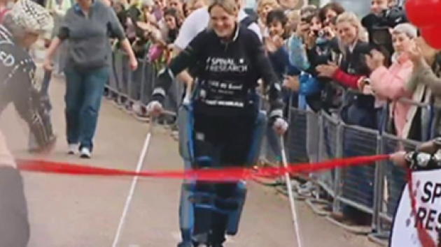 로봇 슈트를 입은 여성이 마침내 결승선을 통과합니다.