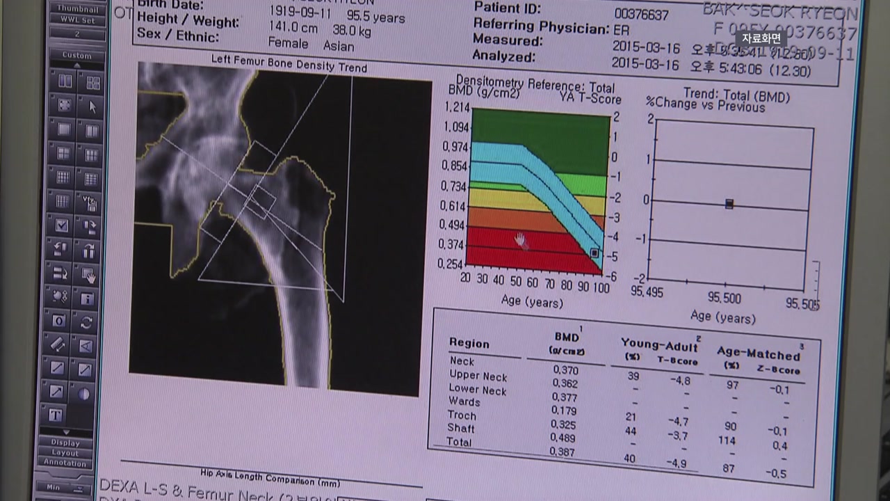[김범준 / 서울아산병원 내분비내과 교수 : 작은 충격에도 골절이 발생했다 또는 뼈에 나쁜 질환이나 약재를 복용하는 경우에도 꼭 뼈 나이를 측정할 수 있는 골밀도를 통해서 자신의 뼈 건강을 확인하는 게 중요하겠습니다.]