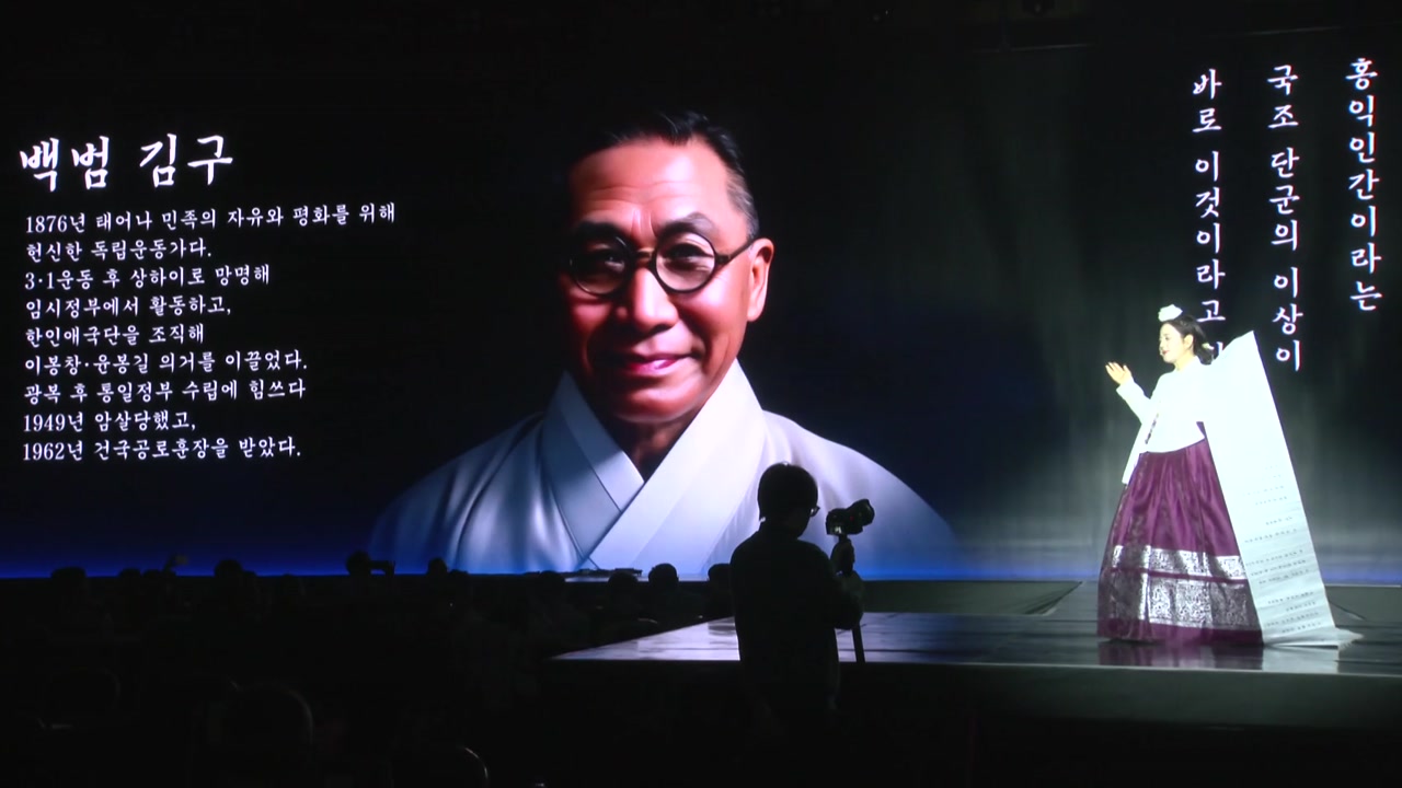 12미터의 거대한 무대 스크린에 AI로 복원된 백범 김구 선생이 나타나, '백범일지'를 함께 낭독하며 인간을 널리 이롭게 한다는 '홍익인간'의 정신을 되새깁니다.