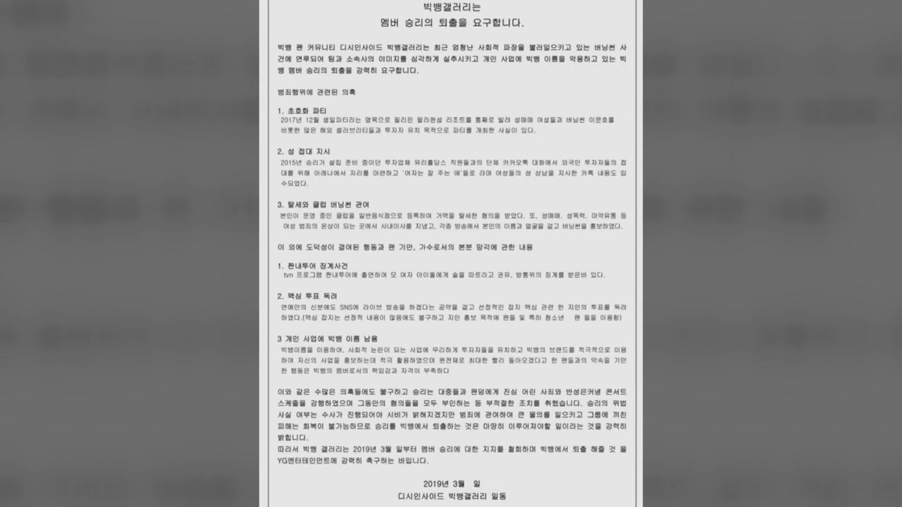또 위법 여부는 수사가 진행되어야 밝혀지겠지만 그룹에 끼친 피해는 회복이 불가능하다면서 승리에 대한 지지를 철회한다고 덧붙였습니다.