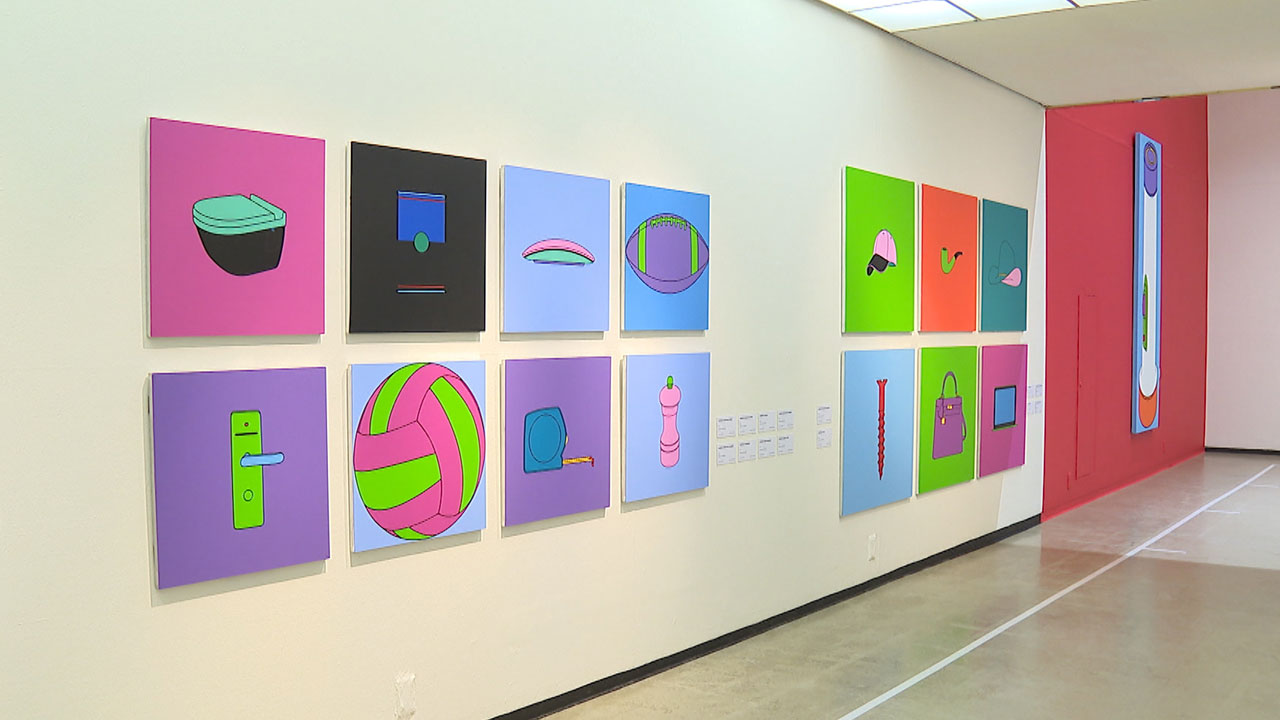 우산과 스마트폰, 전구를 수직으로 그려낸 작품은 일부 만을 보여줍니다.