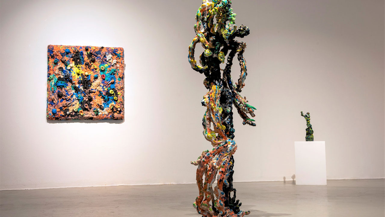 작가는 손으로 점토를 빚어 뼈대에 붙여가며 다채롭게 굴곡을 만든 뒤 다시 작은 조각물들을 덧붙이고 물감을 덧발라 회화와 조각이 뒤섞인 새로운 조형물을 탄생시킵니다.