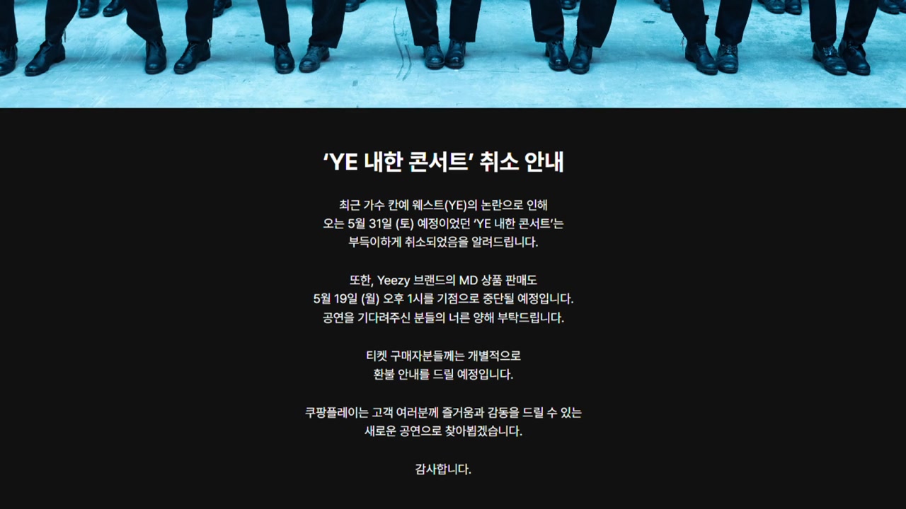공연 주최사인 '쿠팡 플레이'는 오늘(19일) "최근 논란으로 인해 오는 31일 예정이었던 '예(YE)' 내한 콘서트가 부득이 취소되었다"고 밝혔습니다.
