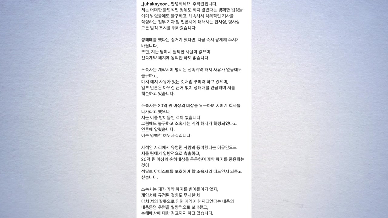이어 팀에서 부당하게 내쫓고 아무 근거 없이 계약 해지를 주장하는 소속사와 확인되지 않은 사실로 성매매를 언급하며 상처를 주는 일부 언론에 대해 끝까지 책임을 묻겠다고 경고했습니다.