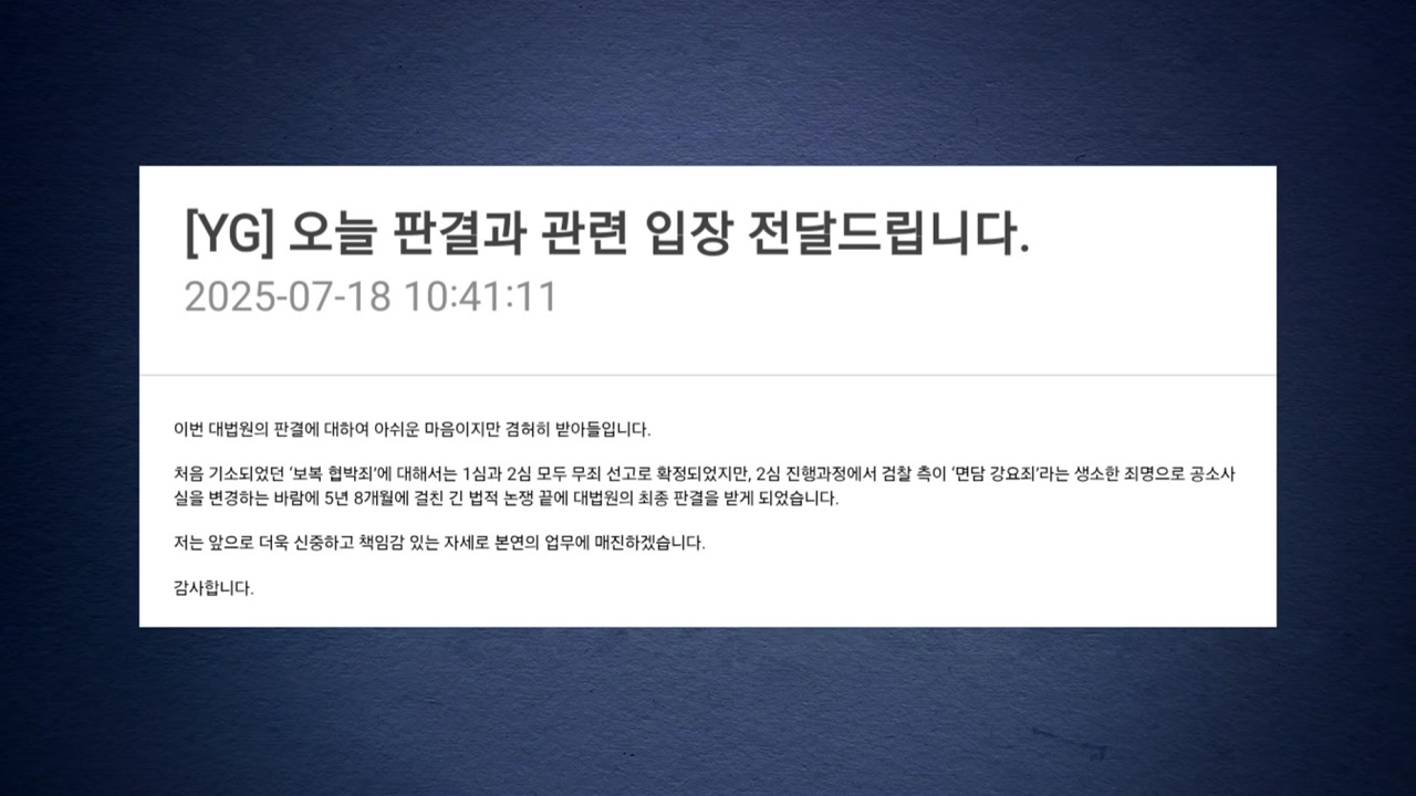 앞서 대법원은 소속사 가수의 마약 혐의를 무마하기 위해 제보자를 협박한 혐의로 기소된 양현석 전 대표에게 징역 6개월에 집행유예 1년을 선고한 원심을 그대로 확정했습니다.