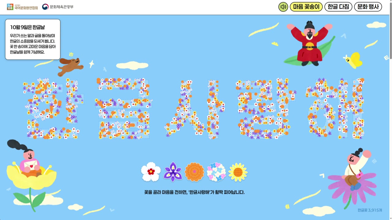 누리집을 접속해 해바라기, 수국 등 꽃 하나를 선택해 가상 글자판에 꽂는 형식인데 18일까지 열리고 국민 누구나 참여할 수 있습니다.