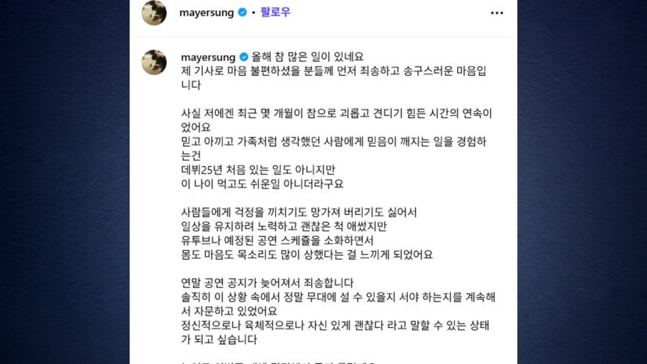 이와 관련해 성 씨도 자신의 SNS에 글을 올려, 가족처럼 생각했던 사람에게 믿음이 깨지는 일을 경험하는 건 쉬운 일이 아니었다는 심경을 밝히며, 매년 열어오던 연말 콘서트 진행 여부를 고심하고 있다고 덧붙였습니다.