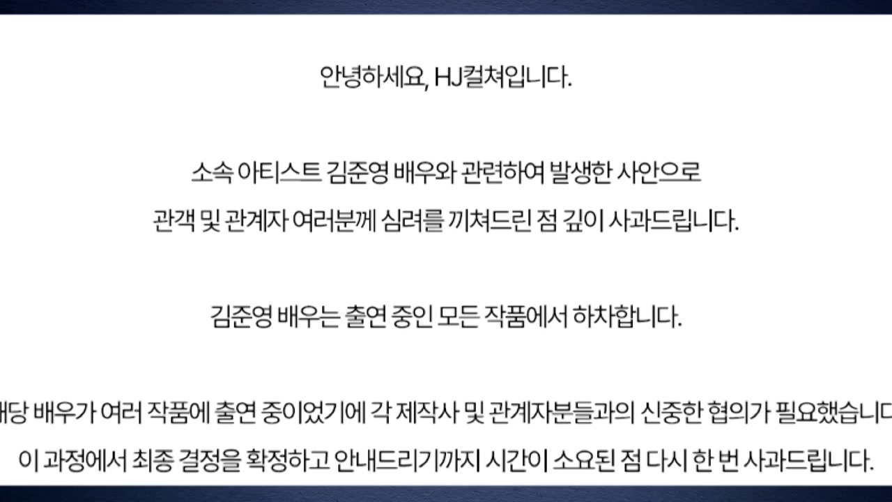 김준영의 소속사이자 공연제작사 HJ컬처는 소속 아티스트와 관련해 관객과 관계자 여러분께 심려를 끼쳐 사과한다며 김준영이 출연 중인 모든 작품에서 하차한다고 밝혔습니다.