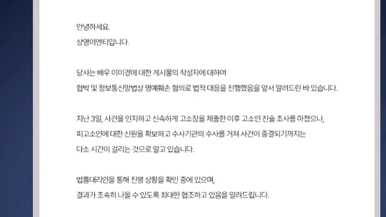 소속사 상영이엔티는 작성자와 유포자들의 악의적인 행위로 배우와 소속사의 피해가 극심하다며 이같이 밝혔습니다.