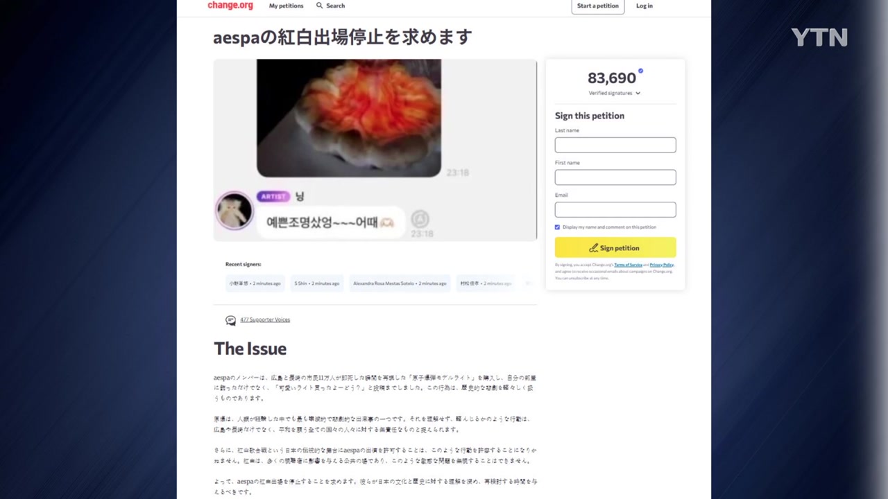 지난 17일 글로벌 온라인 청원 플랫폼 '체인지'에는 일본 NHK 연말 특집 프로그램 '홍백가합전'에 에스파가 출연해선 안 된다는 글이 올라왔습니다.
