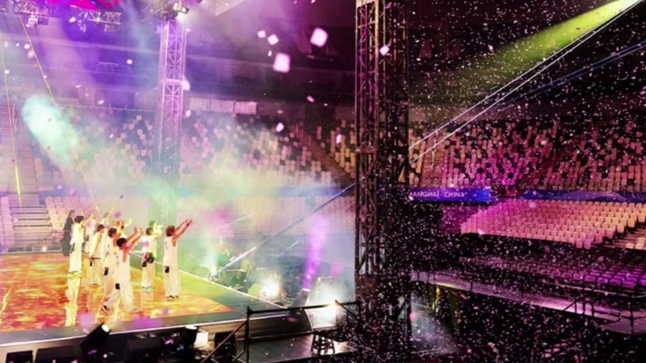갑자기 조명과 음악이 꺼지더니 무대가 중단됩니다.