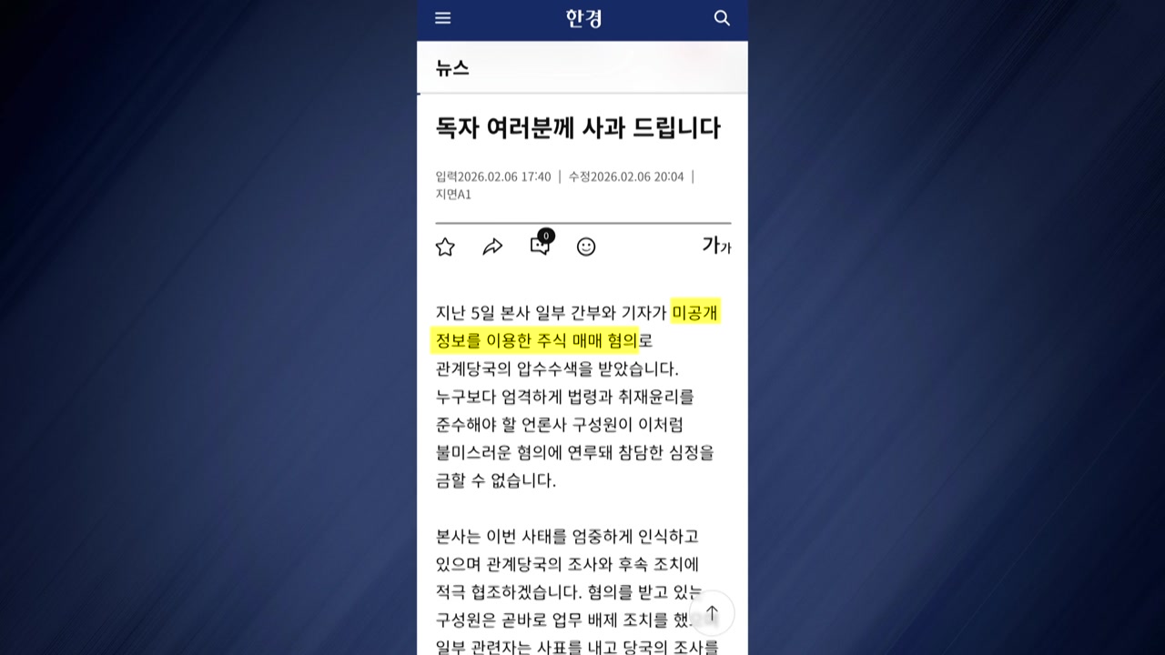한국경제신문은 7일 자 신문 가판 1면에 사과문을 게재하고 지난 5일 본사 일부 간부와 기자가 미공개 정보를 이용해 주식 매매 혐의로 관계 당국의 압수수색을 받았다고 밝혔습니다.