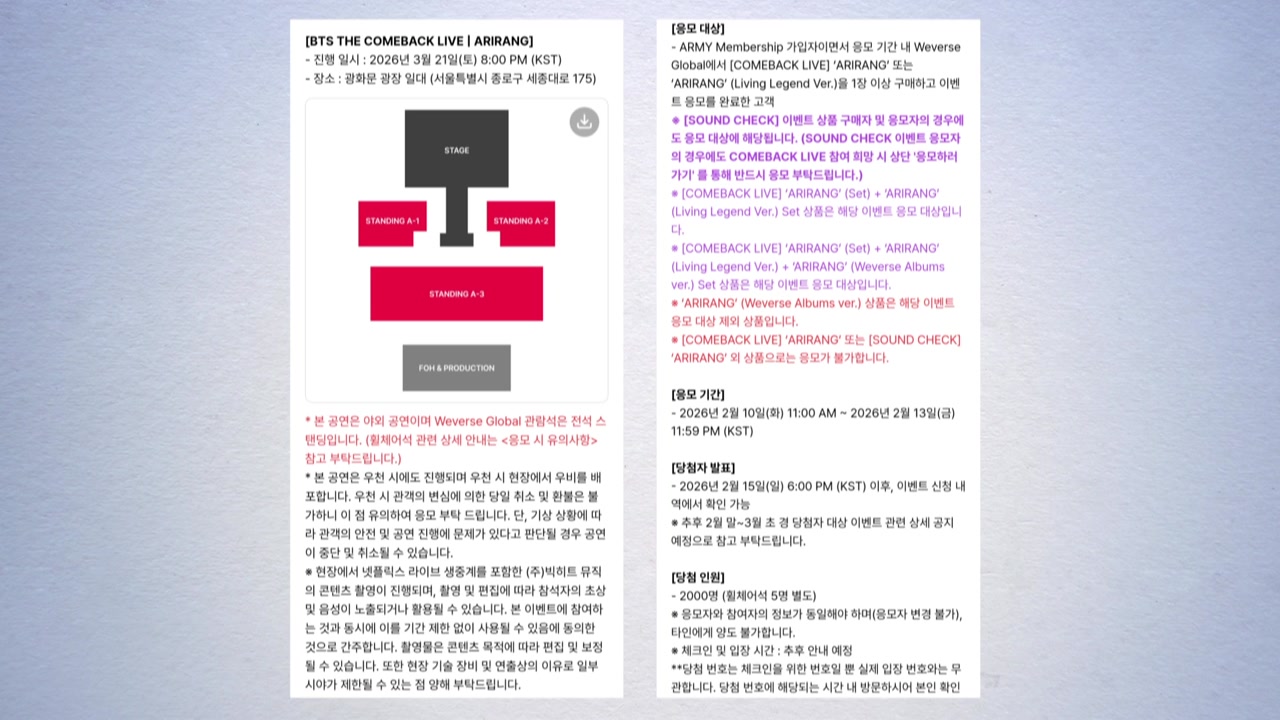 다음 달 열리는 BTS 광화문 공연과 관련해 팬덤 ’아미’를 위한 관람권 응모가 오늘(10일)부터 시작됐습니다.
