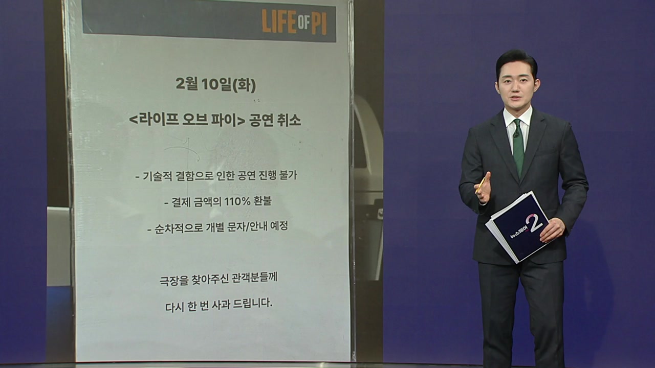 어제저녁 시작될 공연 ’라이프 오브 파이’가 ’기술적 결함’으로 공연이 취소됐고 결제 금액 110%를 환불한다는 공지입니다.