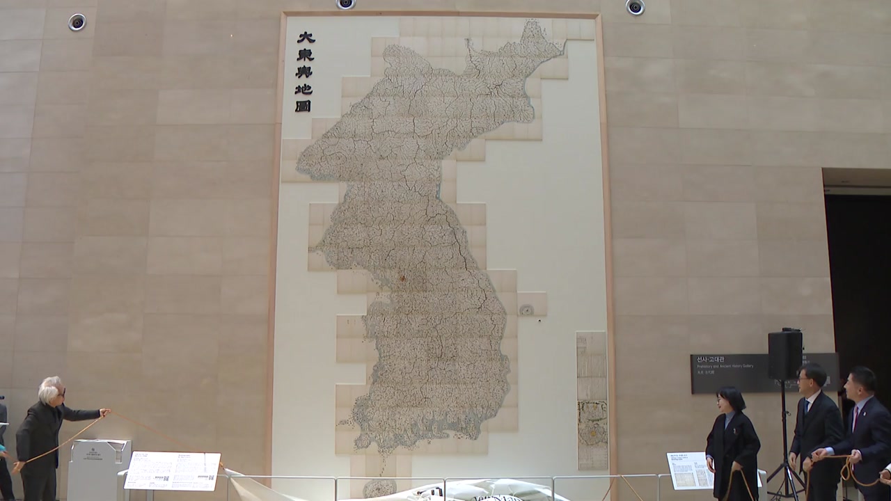 22첩으로 된 지도를 펼치고 이어 붙여 한 장의 대형지도로 다시 만든 대동여지도가 국립중앙박물관 벽면에 걸렸습니다.