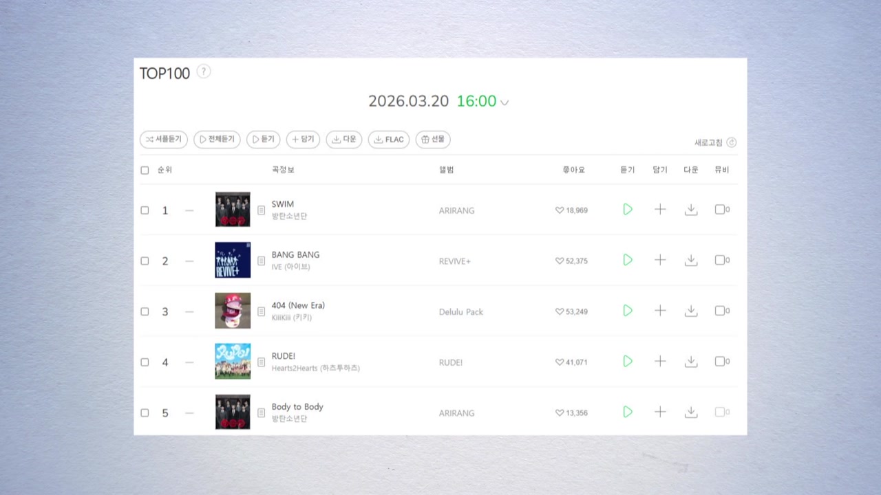 이외에도 아리랑 선율이 녹아 있는 '바디 투 바디(Body to Body)'를 비롯해, 신보에 수록된 노래 14곡이 모두 탑 100 차트에 이름을 올렸습니다.