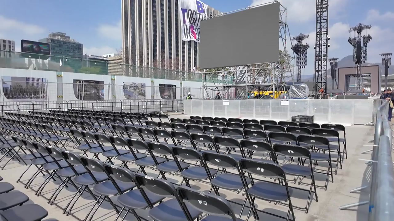 BTS는 뒤에 보이는 경복궁 안에서 광화문을 거쳐 이곳 월대를 지난 뒤, 앞에 보이는 공연장까지 이어지는 이른바 '왕의 길'을 재현할 거로 보입니다" "앉는 자리가 마련된 관객석 앞입니다.