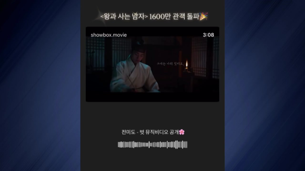 배급사 쇼박스에 따르면, '왕과 사는 남자'는 주말인 그제(4일) 하루 12만 명을 동원해 누적 관객 수 1,599만 명을 기록한 데 이어 오늘 오전 1,600만 고지를 넘었습니다.