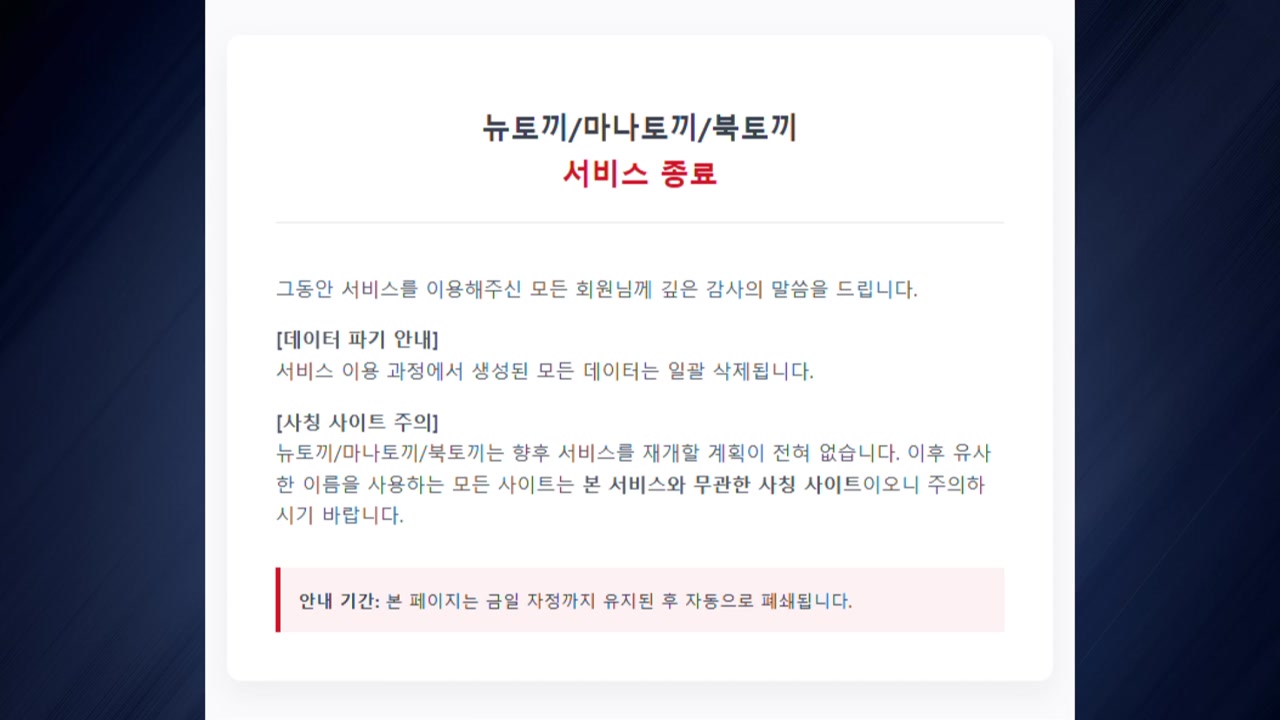 '뉴토끼' 운영자는 공지를 통해 서비스 종료 사실을 알리면서, 향후 서비스를 재개할 계획이 전혀 없다고 강조했습니다.