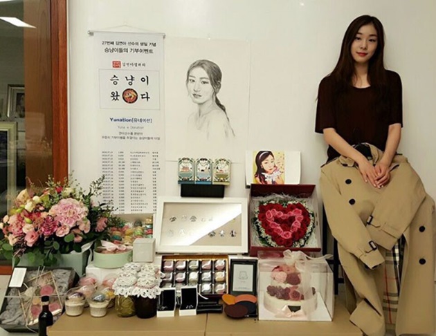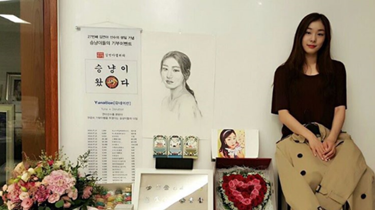 김연아는 팬들이 보내준 선물 옆에서 포즈를 취하며 인증샷을 남겼다. 벽에 붙은 김연아의 초상화, 꽃과 케이크 등 팬들이 전달한 다양한 선물이 눈에 띈다.