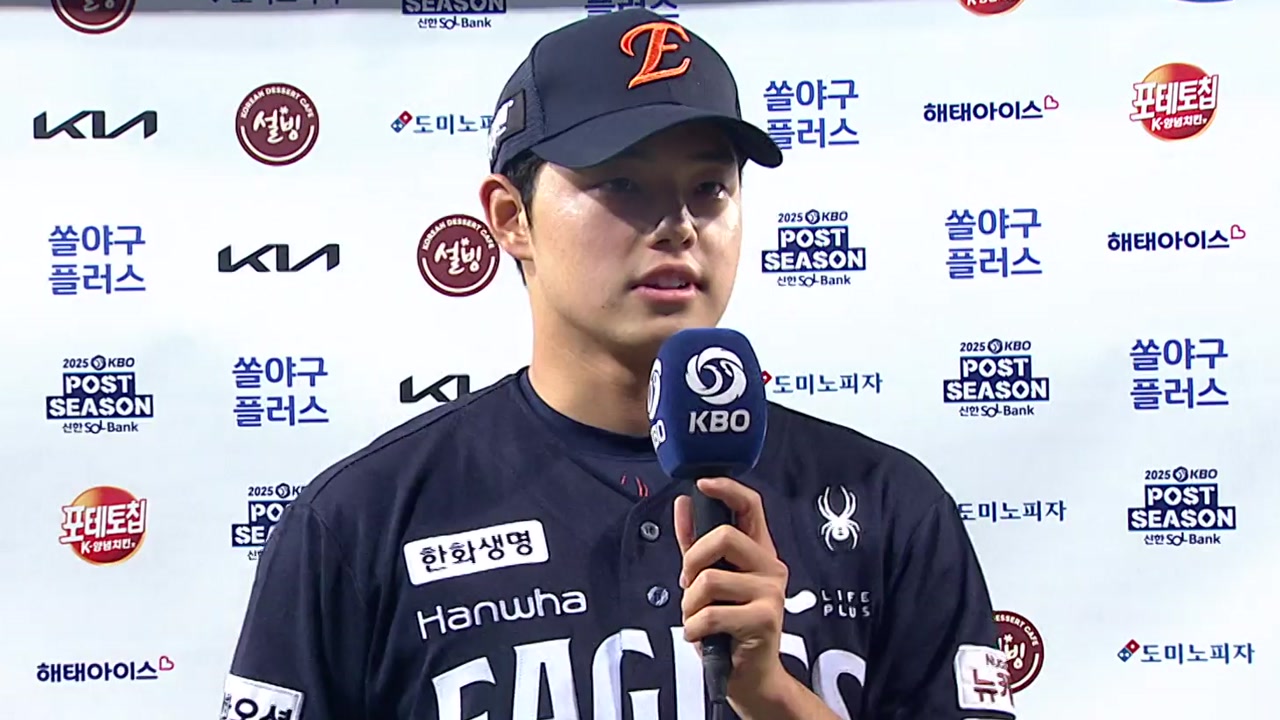 [문동주 / 한화 투수, 데일리 MVP : 1, 3, 5차전이 홀수 경기 숫자들이 좀 더 중요하다는 생각이 들고 좀 더 기로에 놓여있는 경기들이 많다 라고 생각이 드는데 그런 경기에서 제가 나가서 역할을 잘했다는 게 더 의미가 있는 것 같습니다.]