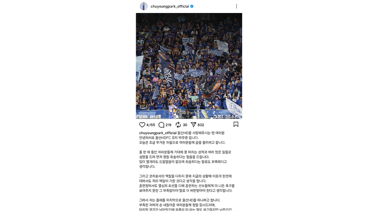 그러면서, 코치의 역할을 다하지 못한 책임이 크다며 올해를 마지막으로 울산을 떠난다고 밝혔습니다.
