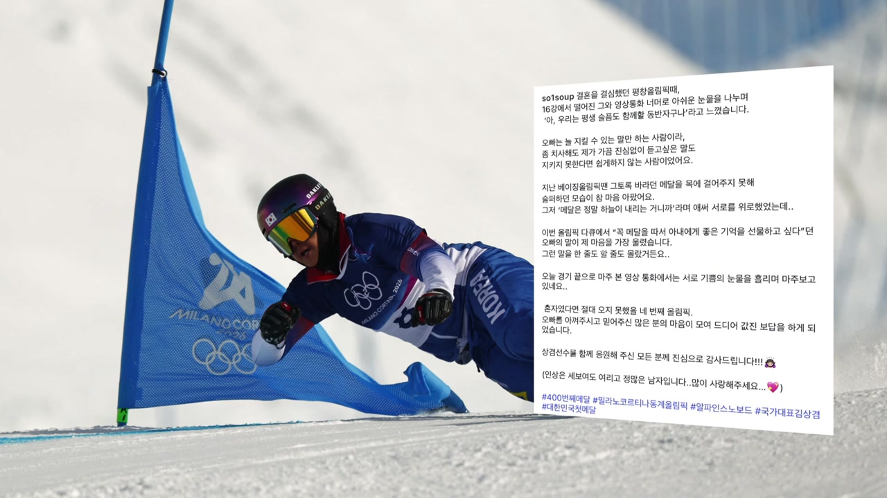 [김상겸 / 스노보드 은메달 : 지금은 너무 행복한 상태고 현실이 좀 믿기지 않는 상태입니다. (아내와) 서로 아무 말 없이 울었던 것 같아요. 이 사람이 나에게 큰 도움 됐다는 느낌을 너무 많이 받고, 가족들도 표현을 해주시더라고요. 오늘 펑펑 울고 하루가 너무 행복한 하루인 것 같아요.]