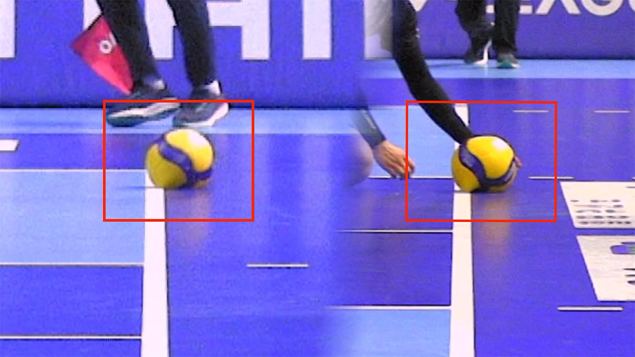 문제는 이 기준이 물리학 앞에서 흔들린다는 점입니다. 배구공은 지름 약 21cm의 입체적인 구체입니다. 코트를 촬영하는 카메라는 지면과 수직을 이루지 않으며, 높은 곳에서 대각선으로 비스듬히 내려다보는 구조입니다. 여기서 이른바 ‘가림 효과'가 작동합니다. 공이 바닥에 닿는 지점보다 공의 몸통이 더 앞쪽으로 튀어나와 있기 때문에, 카메라 렌즈 입장에서는 공의 몸통이 라인을 시각적으로 덮어씌웁니다.