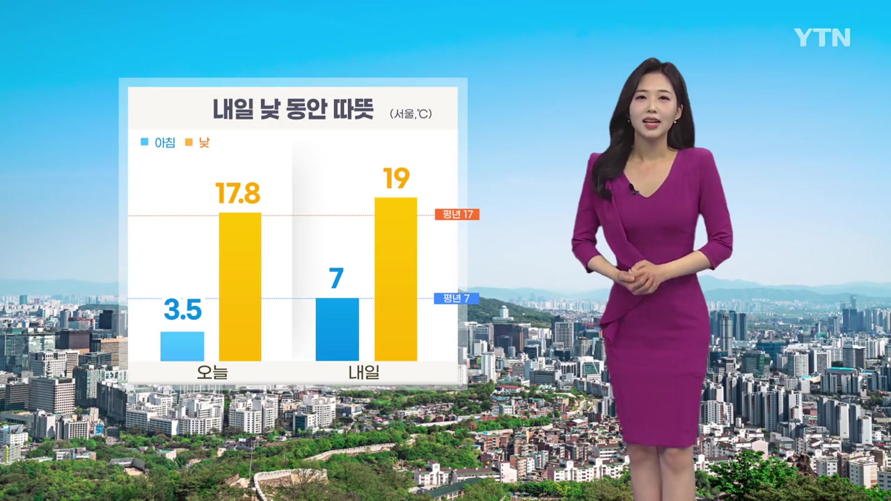 내일은 오늘보다 기온이 더 올라서, 낮 동안에는 따뜻함도 느껴지겠습니다.