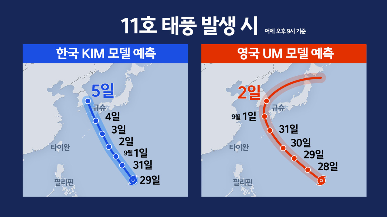 그러니까 우리나라가 개발한 슈퍼컴퓨터 모델 킴 모델입니다. 그리고 킴 모델이 개발되기 전에 우리나라가 주로 사용해 왔던 게 영국의 UM 모델입니다. 태풍이 하나 더 만들어집니다. 10호는 일본 홋카이도 근처까지 올라가서 사라지는데 그 자리에 다시 태풍이 하나 만들어집니다. 그게 11호 태풍이 되는데 11호 태풍을 모델들이 모의하는 걸 보면 킴은 우리나라 쪽으로 올라올 가능성이 상당히 높다. 규슈 서쪽을 지나서 동해안 쪽으로 지나갈 확률이 높다. 그게 시기는 5일 정도쯤으로 모의하고 있고요.