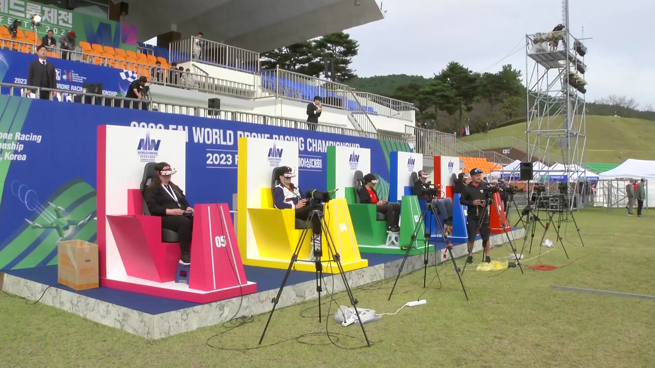 현재 제 뒤로 보이는 커다란 구장에는 장애물들이 설치돼 있고 그 사이로 드론이 날아다니고 있습니다.