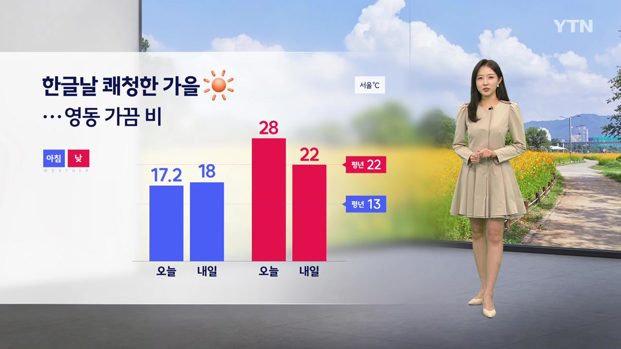 연휴 마지막 날인 내일은 기온이 제자리를 되찾겠고 영동을 제외한 전국에서 맑은 하늘이 드러나겠습니다.
