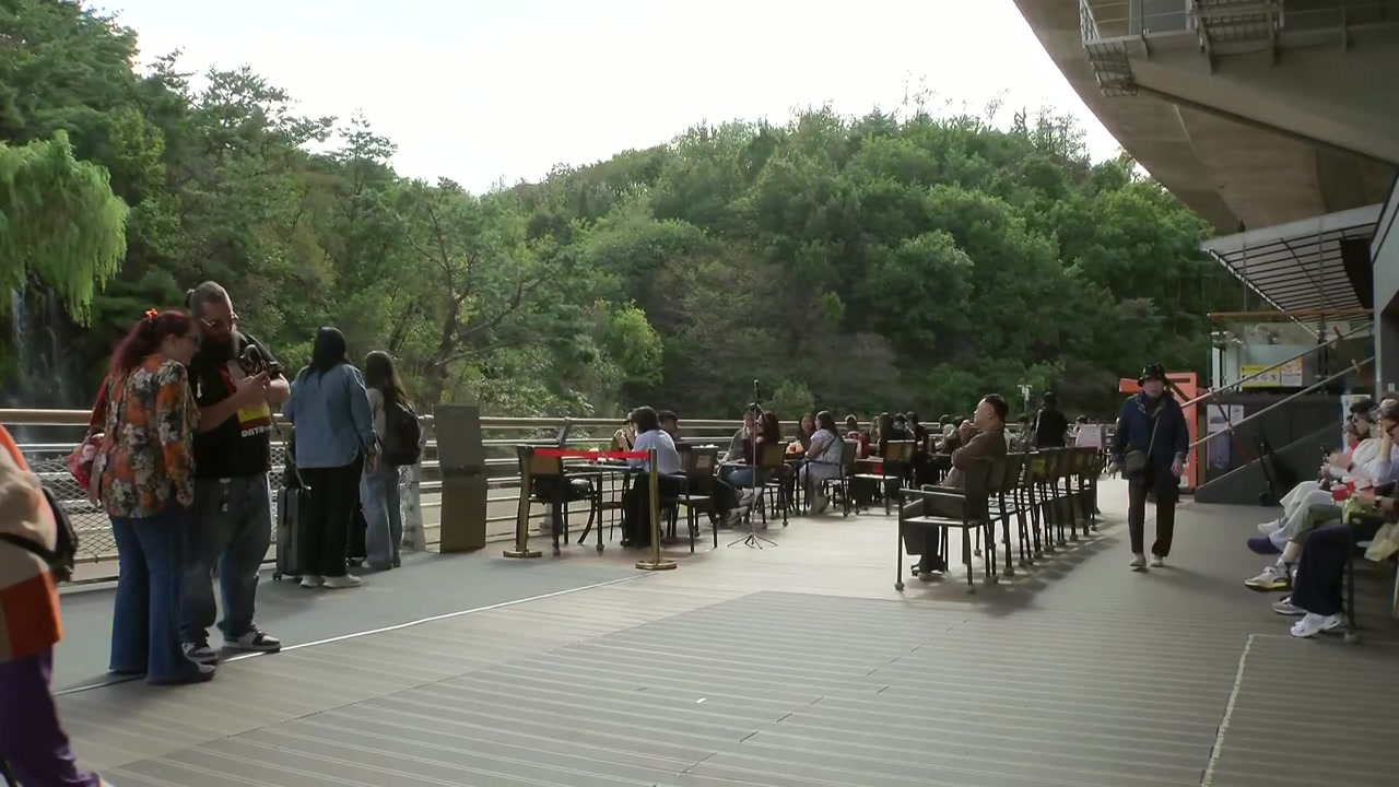 파란 하늘과 초록빛 나무 사이로 떨어지는 인공폭포가 그림 같은 가을 풍경을 자아내고 있습니다.