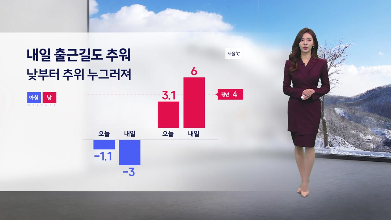 내일 아침은 영하 3도로 오늘보다 더 춥겠지만, 낮부터 차츰 추위가 누그러지겠습니다.