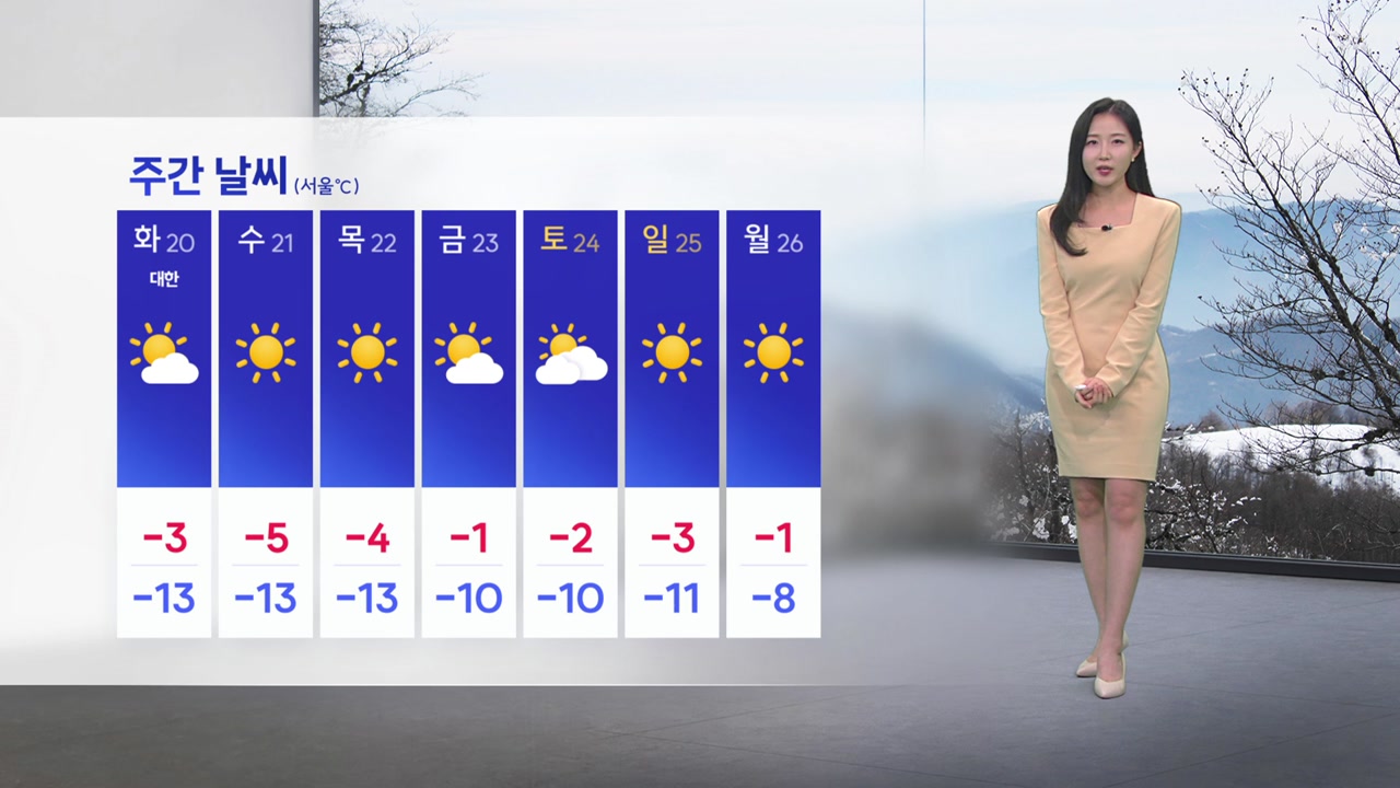 절기 '대한'인 화요일에는 서울 아침 기온이 영하 13도선까지 떨어지겠고요, 주 후반까지 한파가 기승을 부릴 전망입니다.