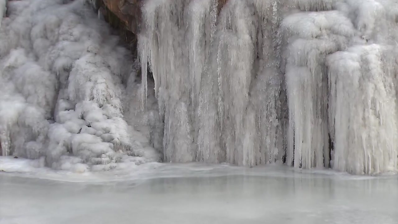 쉴 새 없이 흐르던 물줄기는 사라지고, 도심 폭포는 얼음벽으로 변했습니다.