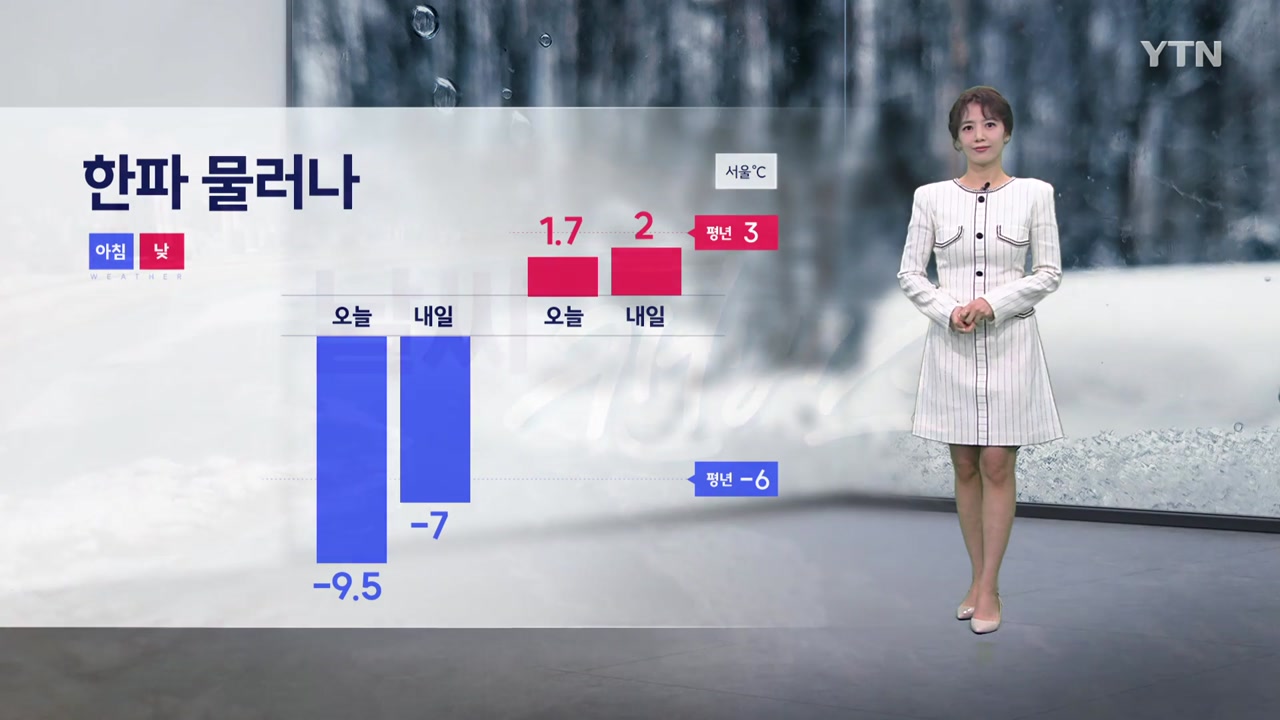 내일은 서울 아침 기온이 영하 7도로 오늘보다 3도 정도 높겠고요, 낮에는 2도로 오늘만큼 올라서 활동하기 수월하겠습니다.