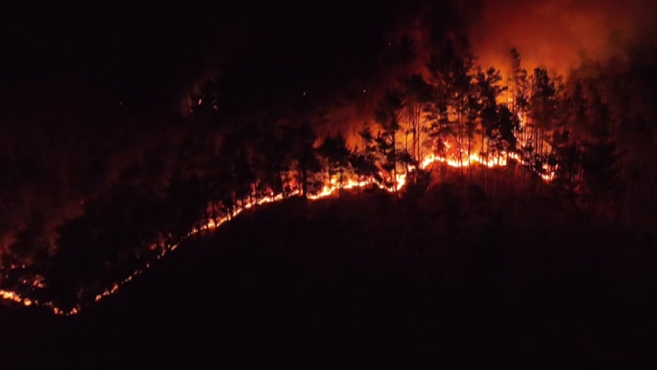 현장에서는 초속 10m 이상의 순간 돌풍에 급경사라는 악조건까지 겹쳐 진화에 어려움을 겪고 있습니다.