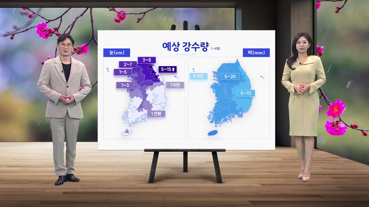 우선 내일 오전까지 5~20mm의 비가 예상되고, 기온이 낮은 내륙에서는 비가 눈으로 바뀌어 내리겠습니다. 앞으로 강원 산간 많은 곳엔 15cm 이상, 강원 내륙과 경기 북동부에 최고 7~8cm의큰 눈이 예상되고요. 이들 지역은 오늘 밤사이 강한 눈이 집중되겠습니다. 약한 시설물은 미리 점검 하셔야겠습니다.