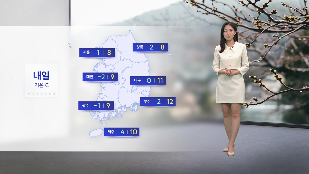 내일 서울 낮 기온은 8도, 대전은 9도, 대구 11도를 보이겠습니다.